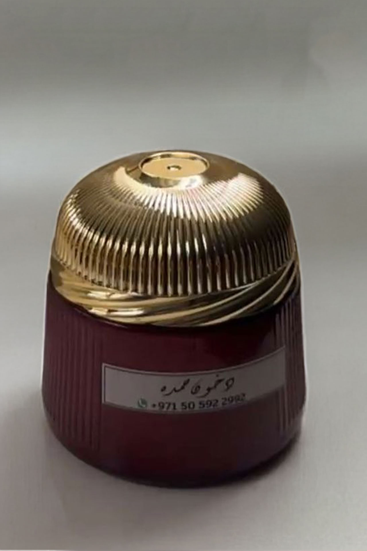 منتج بخور تقليدي يأتي في وعاء زجاجي أحمر أنيق مزين بغطاء ذهبي فاخر، ويحمل ملصقاً يحتوي على اسم المنتج ورقم التواصل الخاص بالمصنع أو الموزع. يُستخدم عادةً لتعطير المنازل والمجالس برائحة شرقية أصيلة.