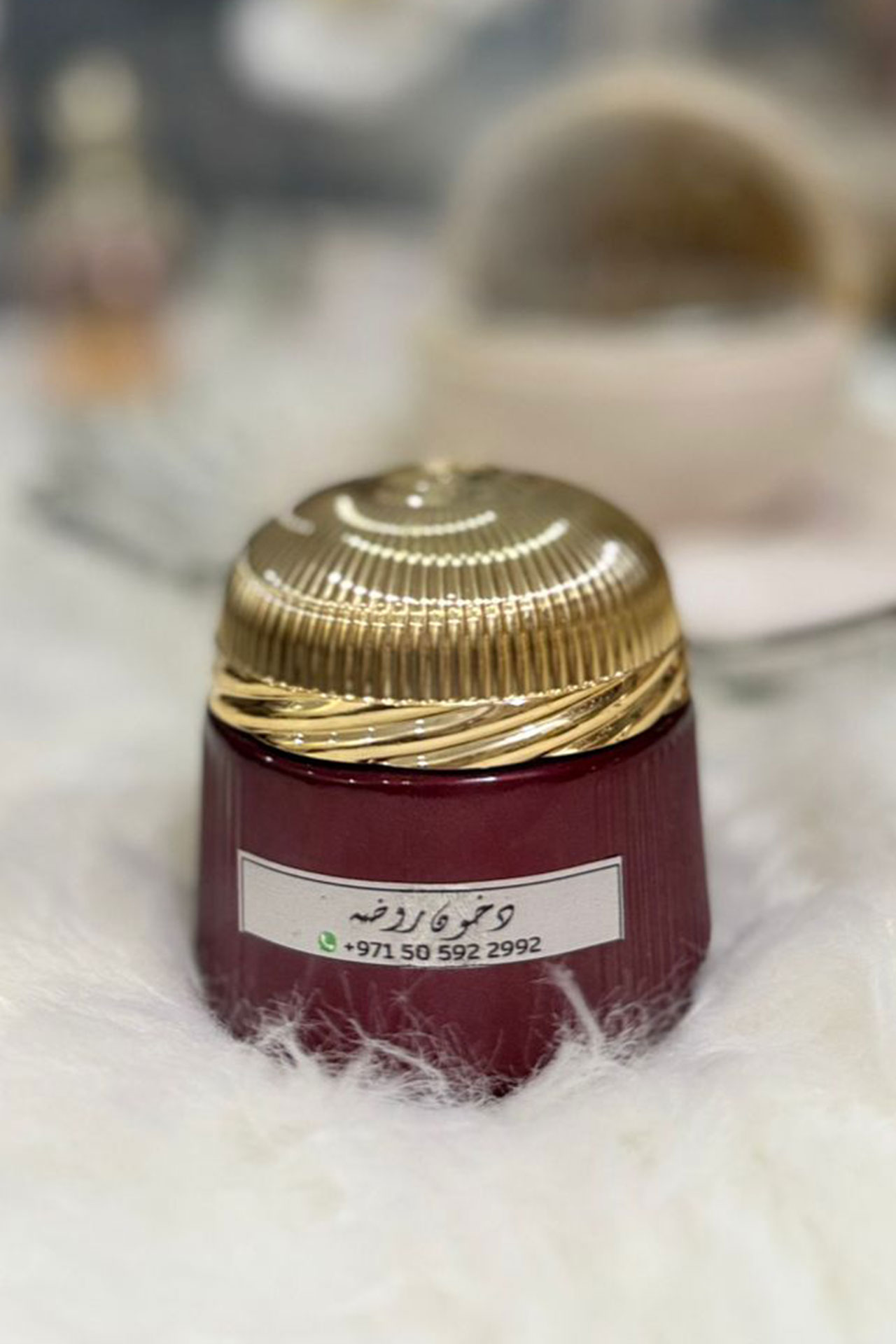 بخور (دخون) إماراتي تقليدي معروض في وعاء زجاجي باللون العنابي الداكن والأنيق، يتميز بغطاء ذهبي فاخر ذو تصميم مضلع.