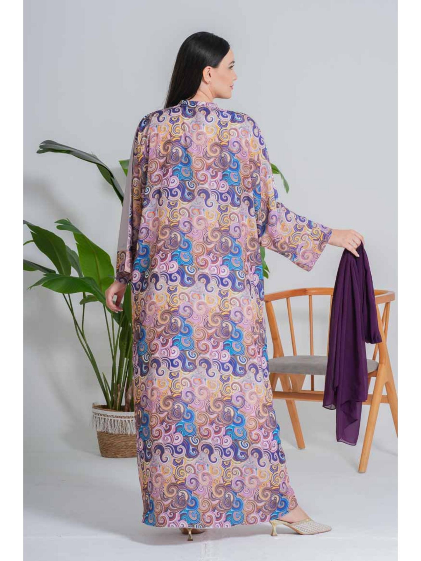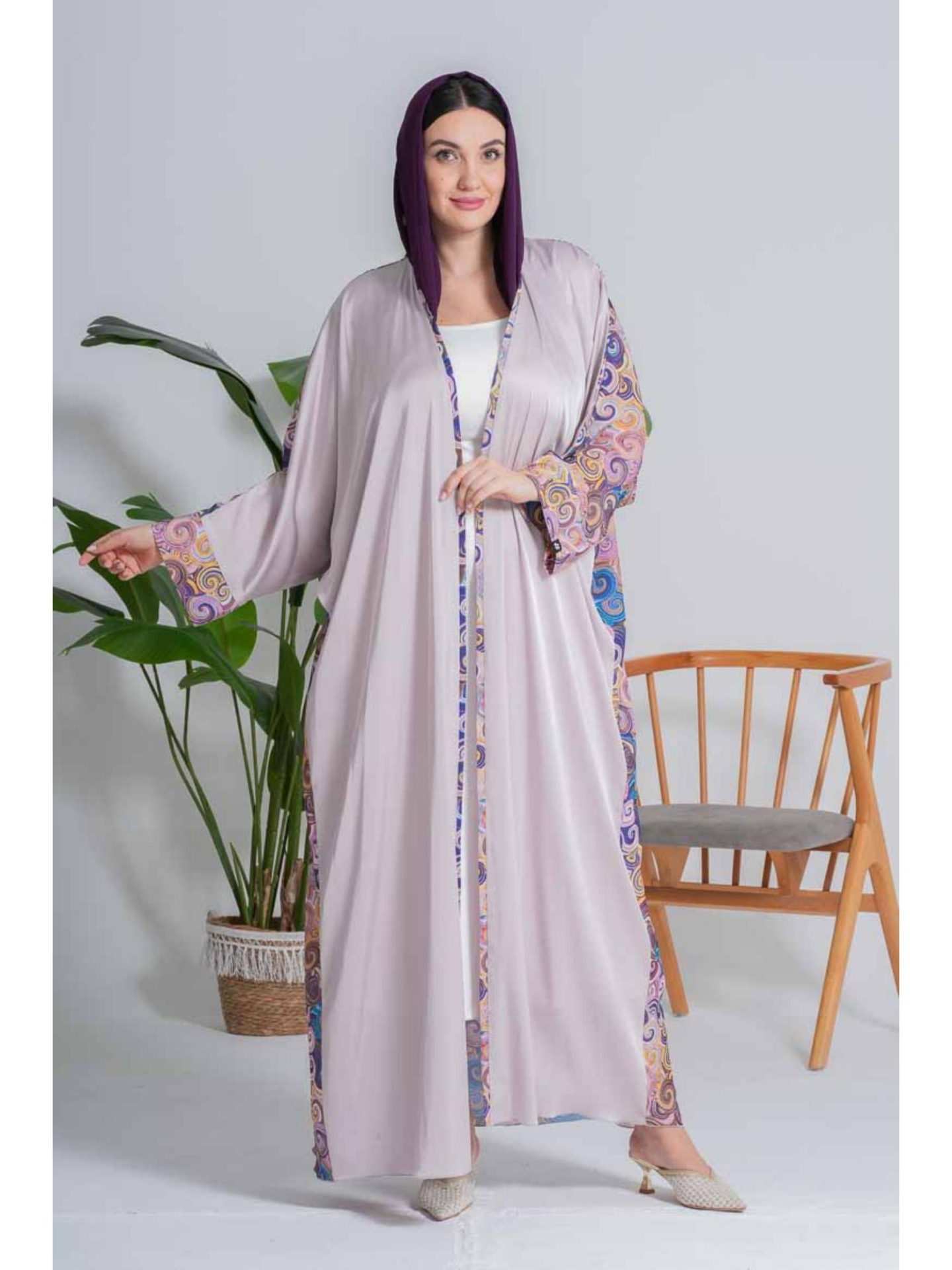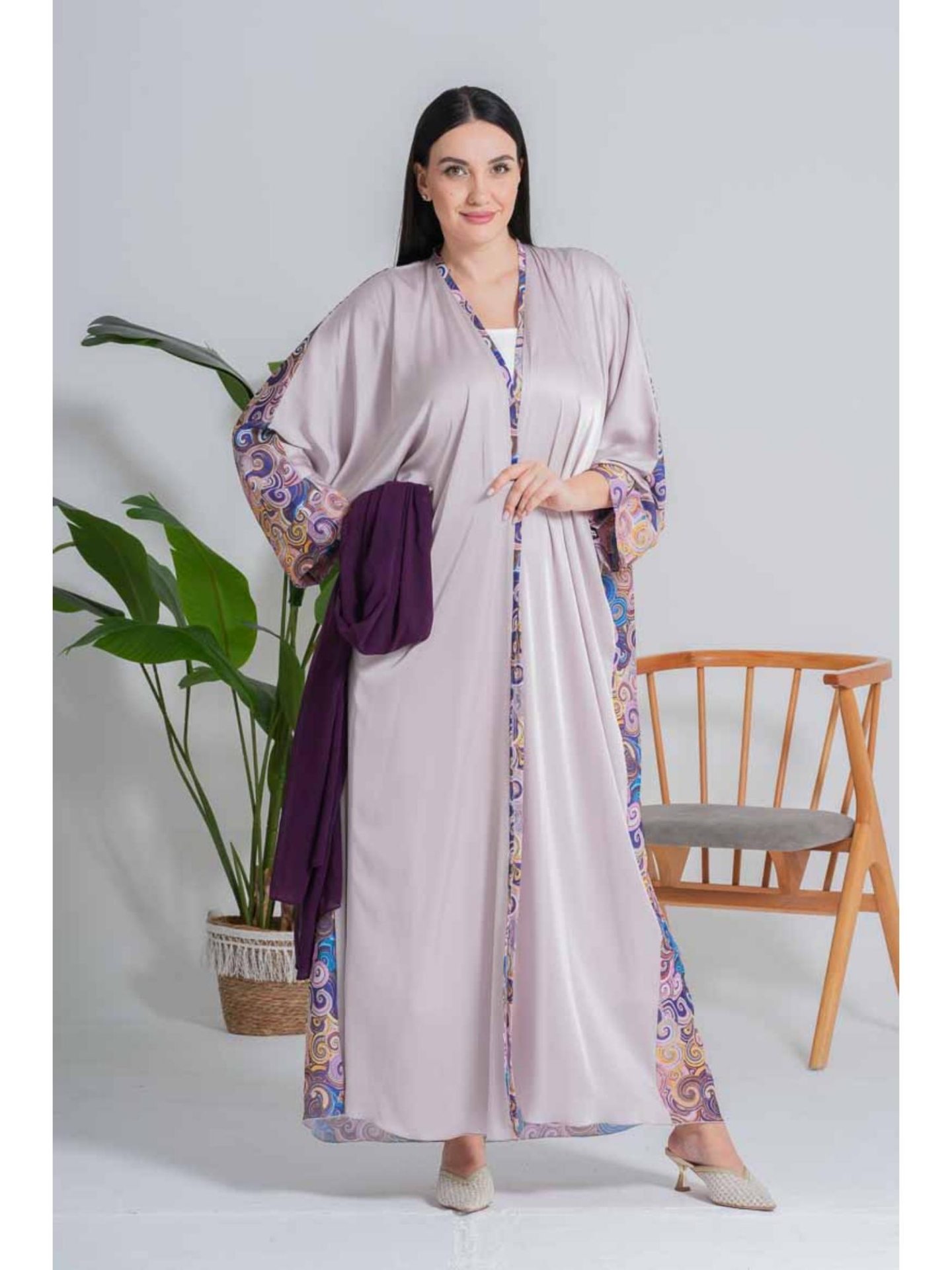 عباءة "ألوان الغروب" هي اختيار جريء ومميز، تعكس روحاً شبابية وعصرية. صُنعت هذه العباءة من قماش ناعم ولامع (مثل الساتان أو الحرير) بلون لافندر هادئ أو رمادي مائل للوردي، مما يمنحها انسيابية رائعة وحركة جذابة. يضفي التصميم الواسع وقصة الكيمونو (Kimono Cut) راحة فائقة ومظهر عصري. تبرز جمال العباءة من خلال المطبوعات الفنية الملونة على شكل دوامات أو خطوط مائية متداخلة بدرجات الأزرق والأصفر والوردي، والتي تزين أطراف الأكمام الطويلة وحواف العباءة الجانبية والأمامية. هذه التفاصيل اللونية تكسر حيادية اللون الأساسي وتجعلها قطعة فريدة. مناسبة جداً للإجازات، الرحلات، أو الخروجات اليومية التي تتطلب أناقة مريحة وغير تقليدية.