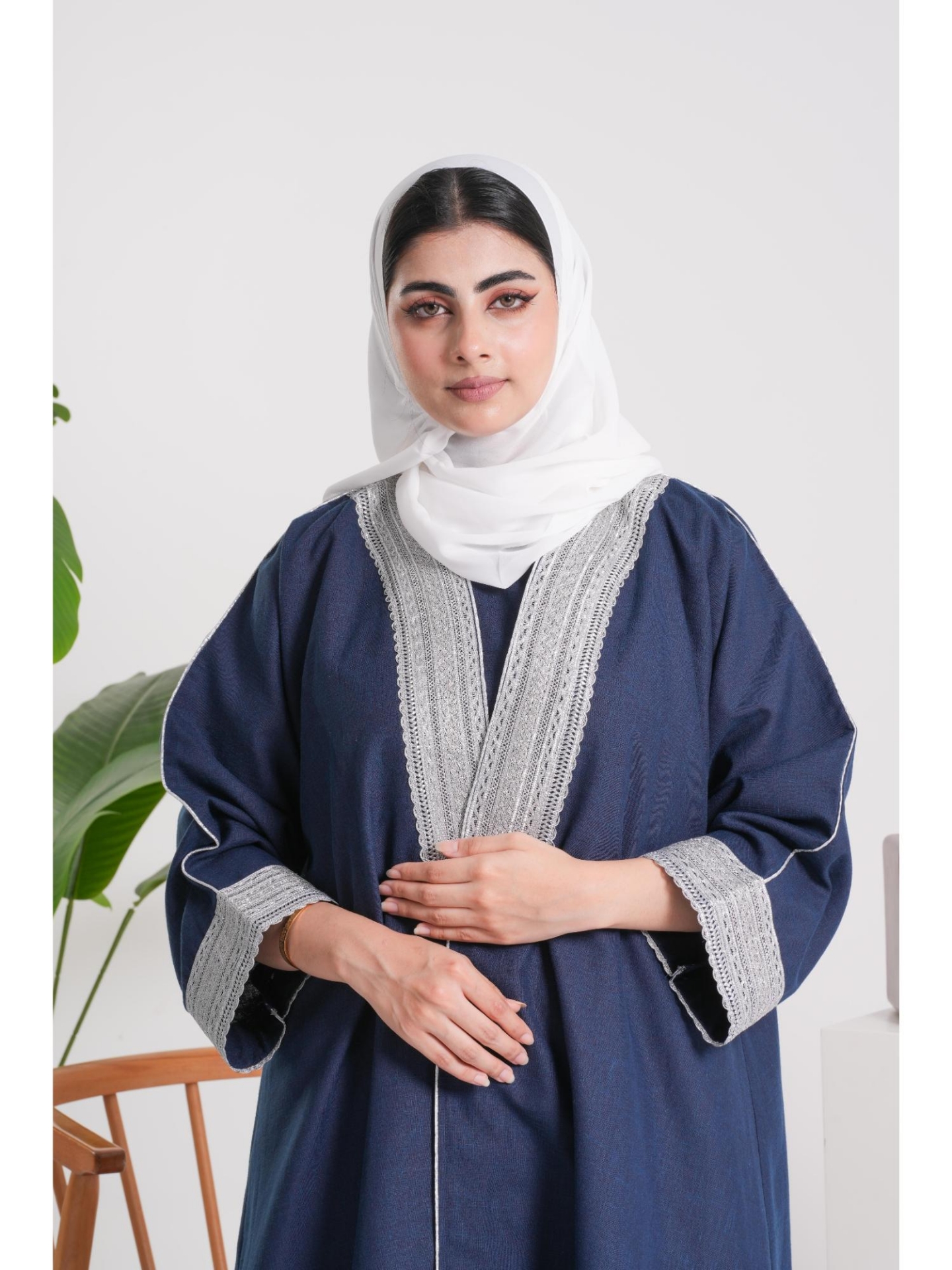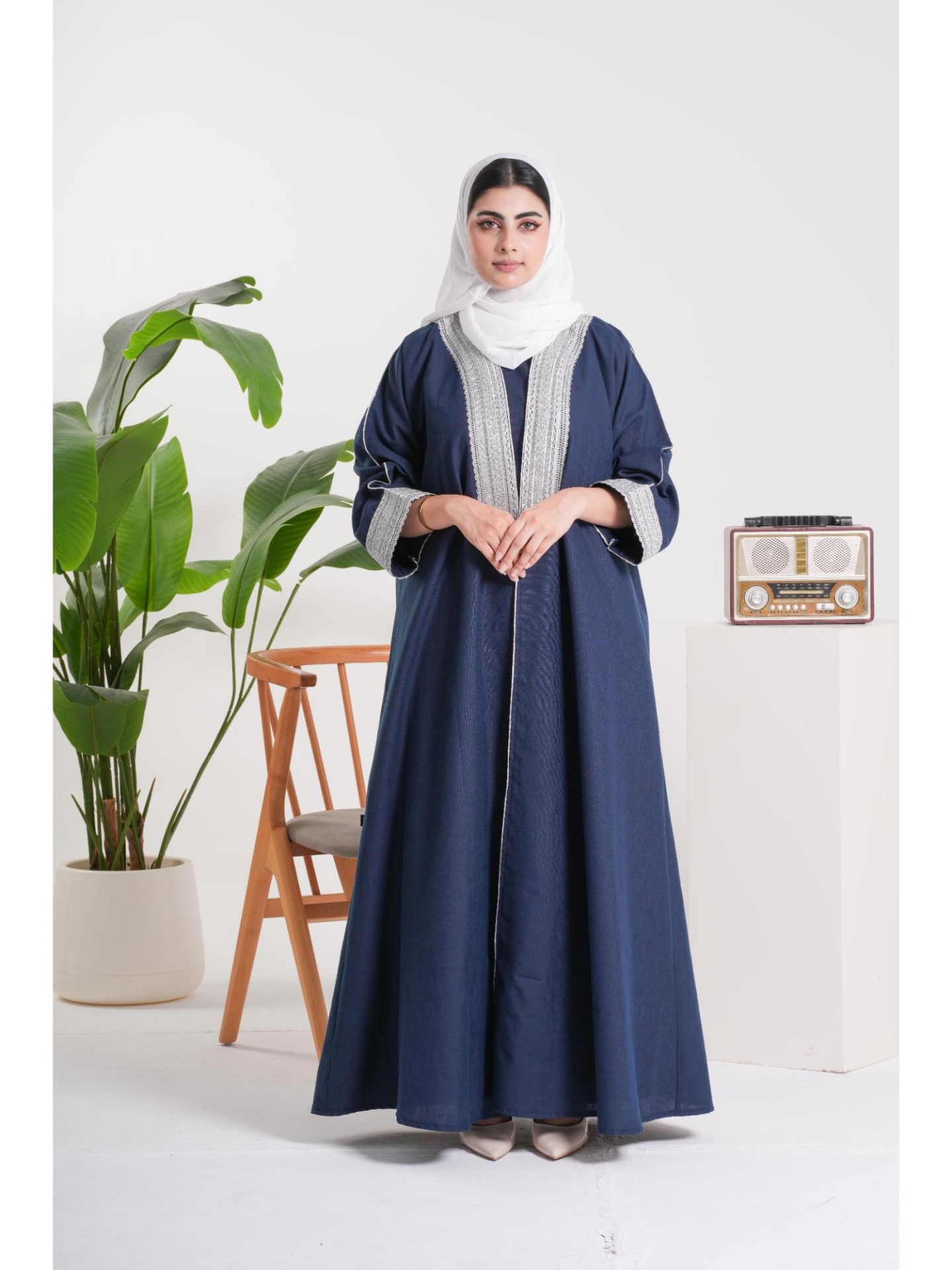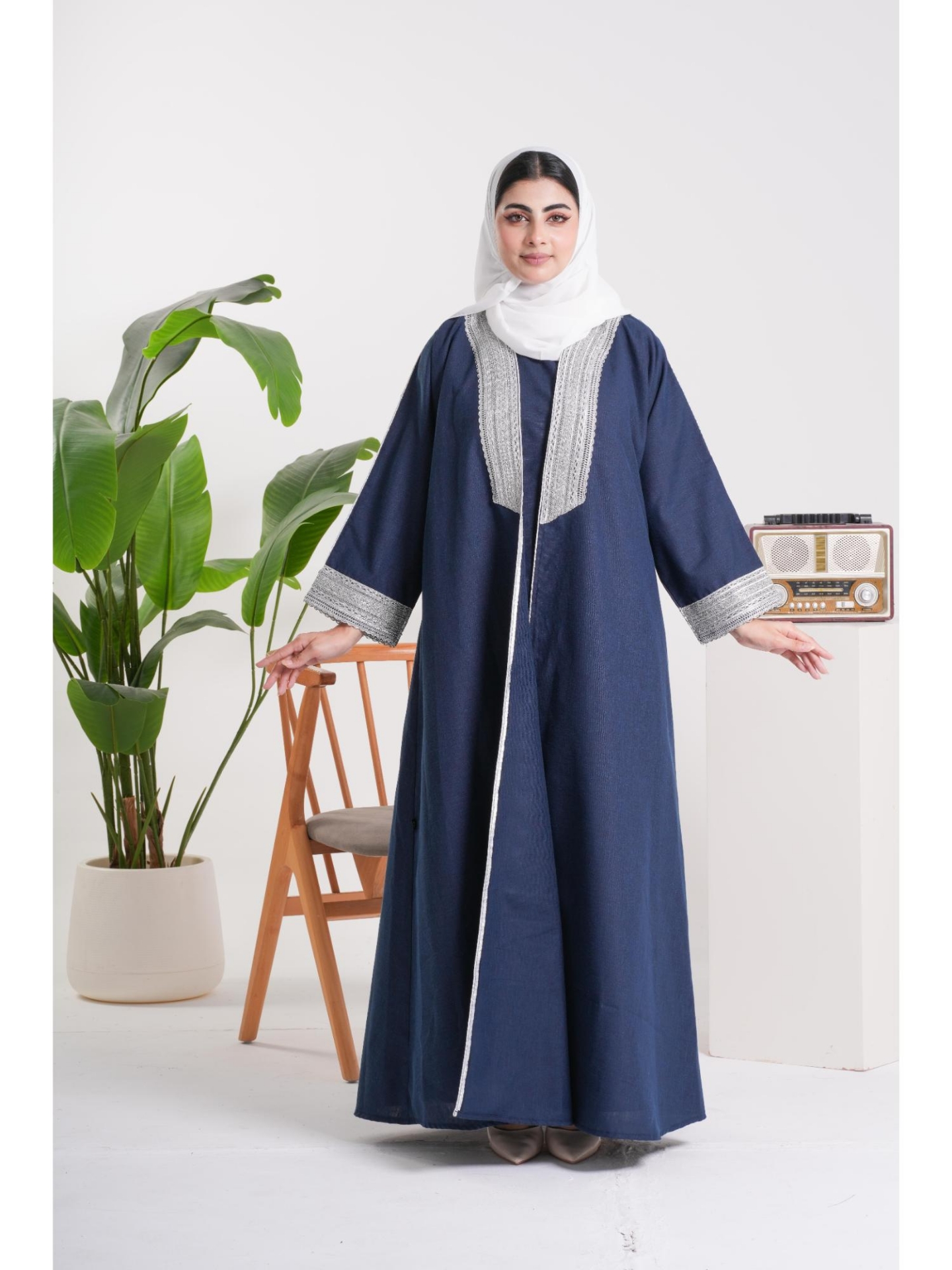 وصف طويل: ارتقي بإطلالتك اليومية والمسائية مع عباءة "كحلي الدنيم الفضي" التي تمزج ببراعة بين الأصالة والموضة الحديثة. صُنعت هذه العباءة من خامة ذات ملمس الدنيم الثقيل نسبياً بلون كحلي غني ودافئ، مما يضمن لكِ مظهراً متفرداً ومريحاً في الوقت ذاته. يبرز جمال التصميم في التطريز الفضي اللامع الذي يزين الأطراف، بدءاً من الياقة وحواف فتحة الصدر نزولاً إلى الأكمام الواسعة، مضيفاً لمسة من الرقي والفخامة. تتميز العباءة بقصتها الواسعة والمريحة (A-line) التي تناسب مختلف أشكال الجسم وتوفر حرية الحركة. يمكن ارتداؤها مفتوحة أو مغلقة (حسب تصميم الرباط الأبيض الأمامي) فوق ملابس أساسية بسيطة لتكون هي القطعة المحورية في إطلالتك. مثالية لإطلالات الخروج، التسوق، أو المناسبات شبه الرسمية.