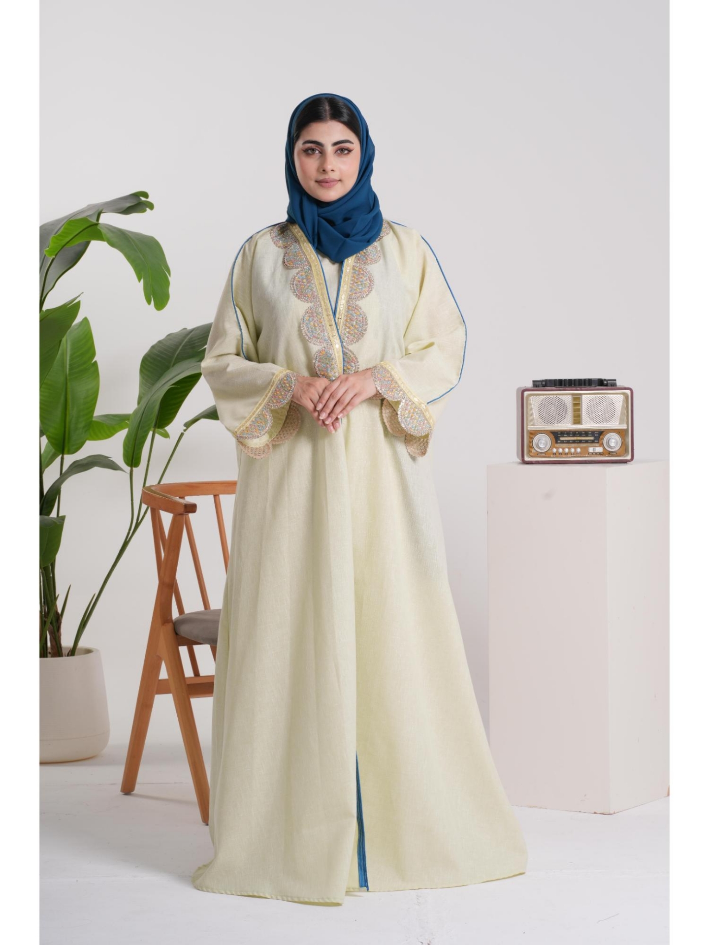 وصف طويل: تتميز عباءة "ليمون آند فيروز" بتصميمها المبهج والراقي، وهي قطعة أساسية لموسم الربيع والصيف. صُنعت العباءة من قماش خفيف الوزن ومريح (كثير الاحتمال من الكتان أو مزيج منه) بلون بيج مائل إلى الليموني الباهت، مما يمنحها إشراقة طبيعية. ينصب التركيز على التطريز المتقن متعدد الألوان الذي يغطي محيط الياقة ومنطقة الصدر على شكل أقواس زخرفية، ويتكرر على أطراف الأكمام الطويلة والواسعة. تُبرز تفاصيل العباءة الحواف الرفيعة (Piping) باللون الكحلي الداكن أو الأزرق الملكي، والتي تحدد الحواف على طول الصدر والأكمام، مضيفة عمقاً وتناسقاً للألوان. تتميز بقصة مستقيمة ومريحة، مما يجعلها خياراً مثالياً لمن تبحث عن الأناقة التقليدية بلمسة عصرية وملونة.
