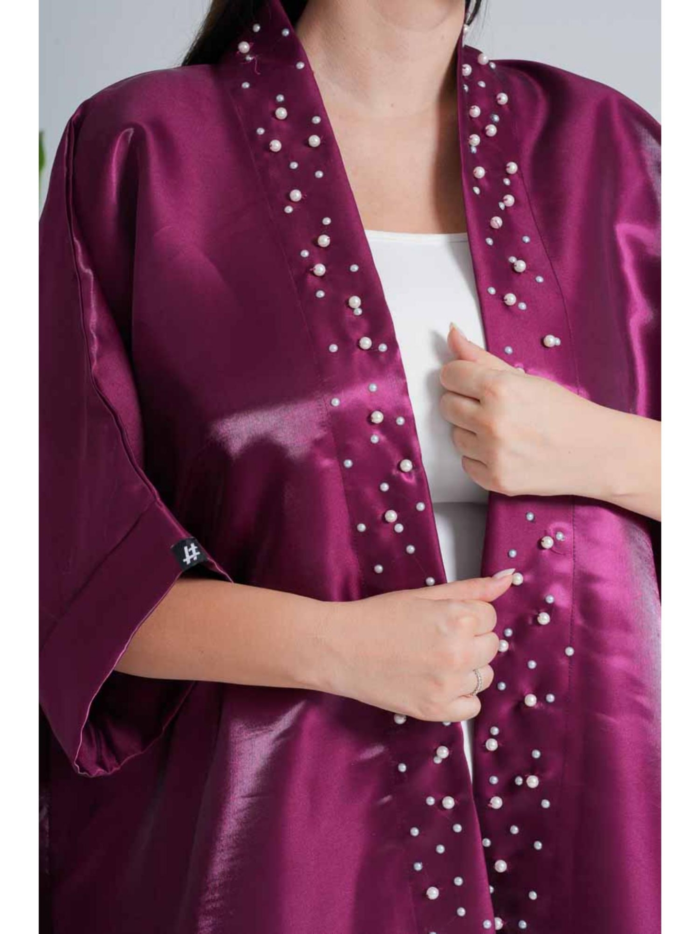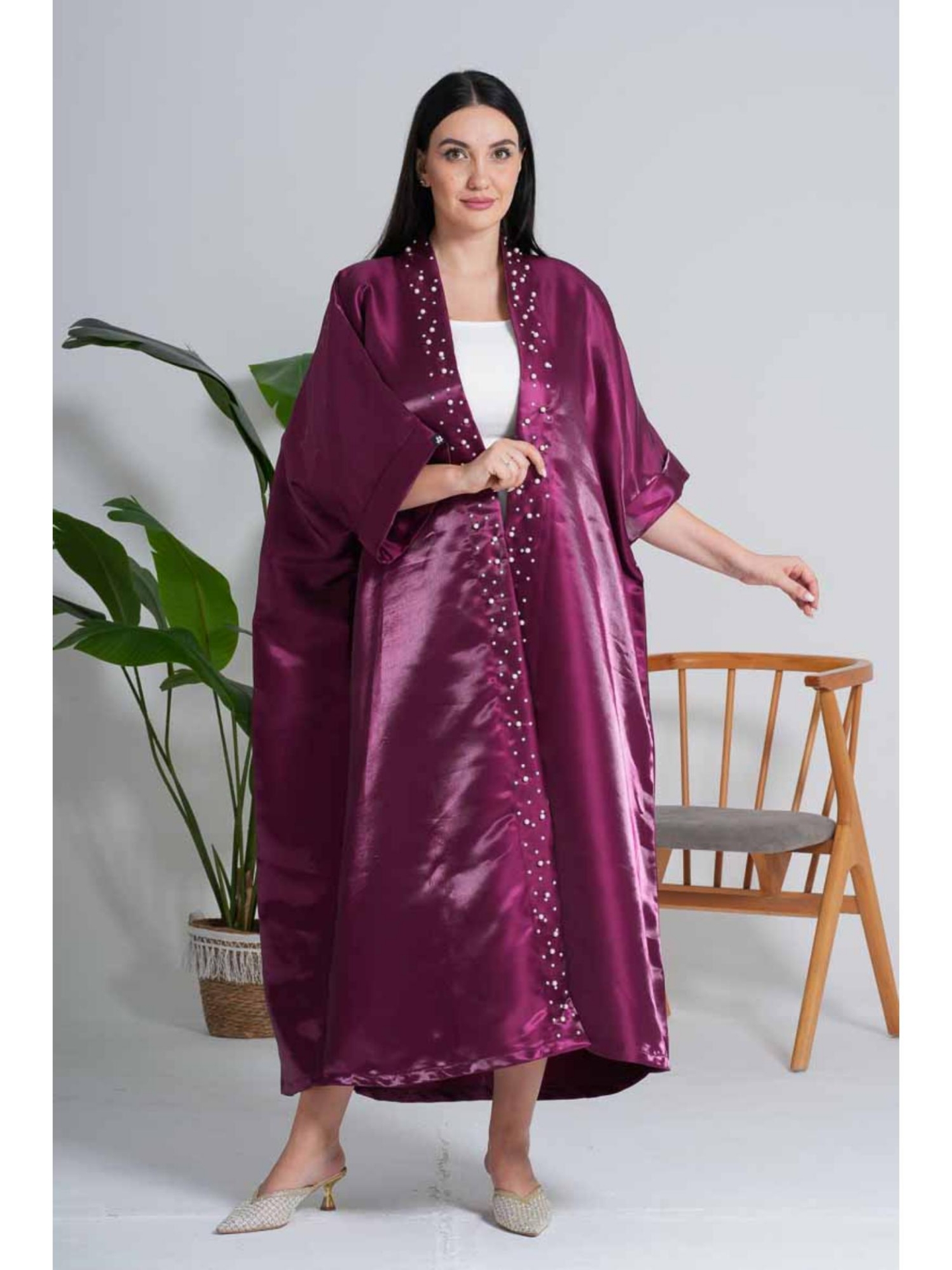 عباءة "الجمان الأرجواني" هي تحفة فنية تلفت الأنظار بلمعتها الفاخرة وتفاصيلها الأنيقة. صُنعت هذه العباءة من قماش الساتان عالي الجودة بلون أرجواني داكن وعميق (Plum)، يتميز بلمعة غنية وحركة انسيابية على الجسم. تصميمها واسع وله قصة كيمونو (Kimono style) مع أكمام واسعة ومريحة تضفي عليها طابعاً عصرياً. النقطة المحورية للتصميم هي تطريز اللؤلؤ الأبيض الصغير المرصع بعناية على طول حواف العباءة الأمامية وحول فتحة الرقبة، مما يضيف تباينًا ناعمًا وفخامة هادئة. اللون الأرجواني الداكن يجعله خياراً مثالياً للسهرات والأمسيات، حيث يمكن تنسيقه مع مجوهرات فضية أو ماسية بسيطة. هذه العباءة هي الخيار الأمثل لمن تبحث عن الأناقة الكلاسيكية بلمسة عصرية من الألوان الجريئة والمواد الفاخرة
