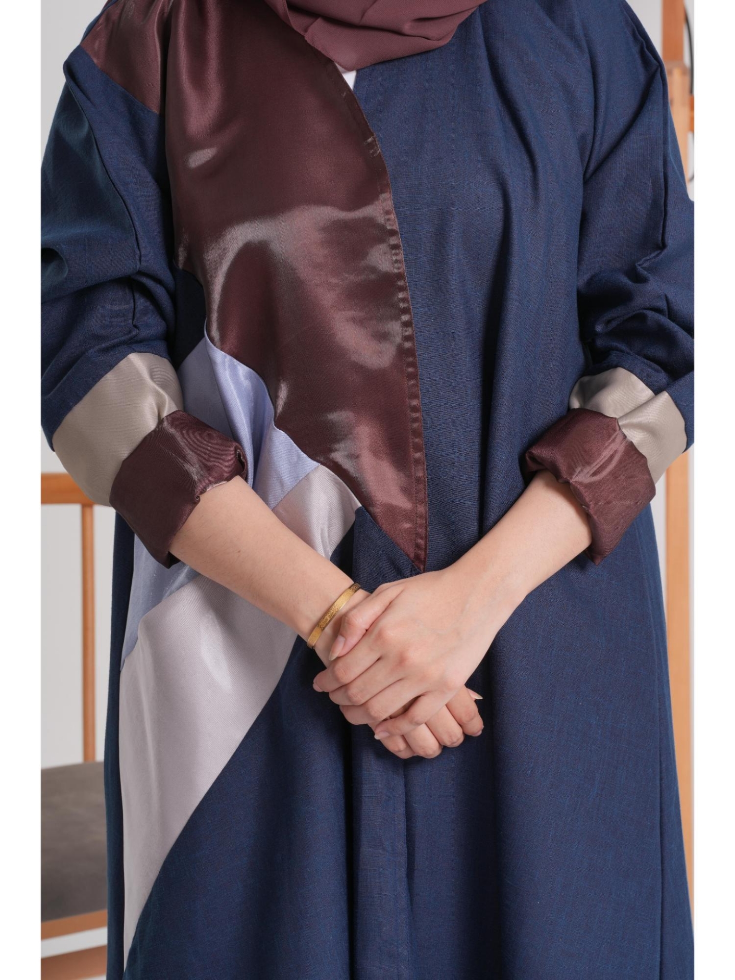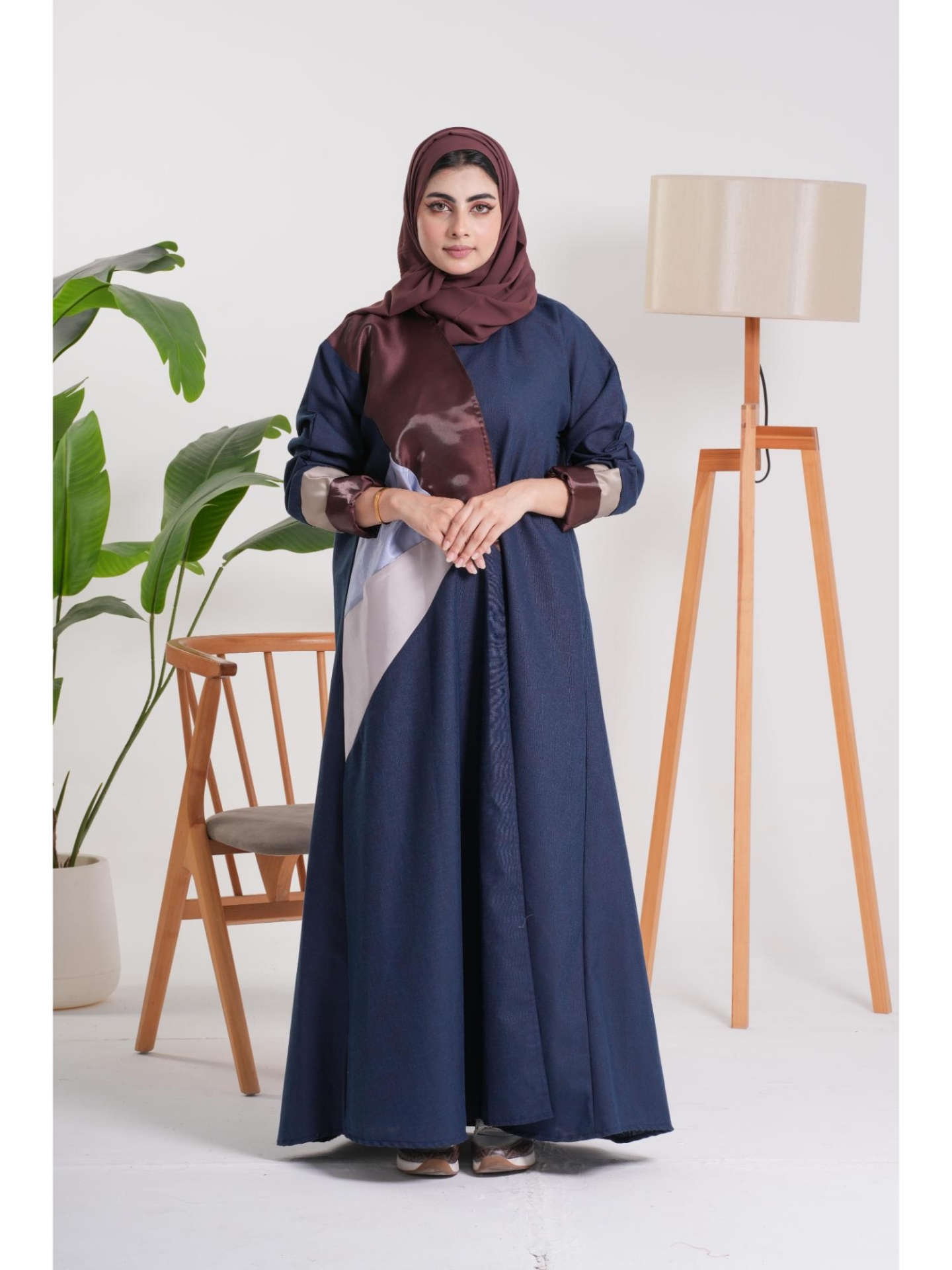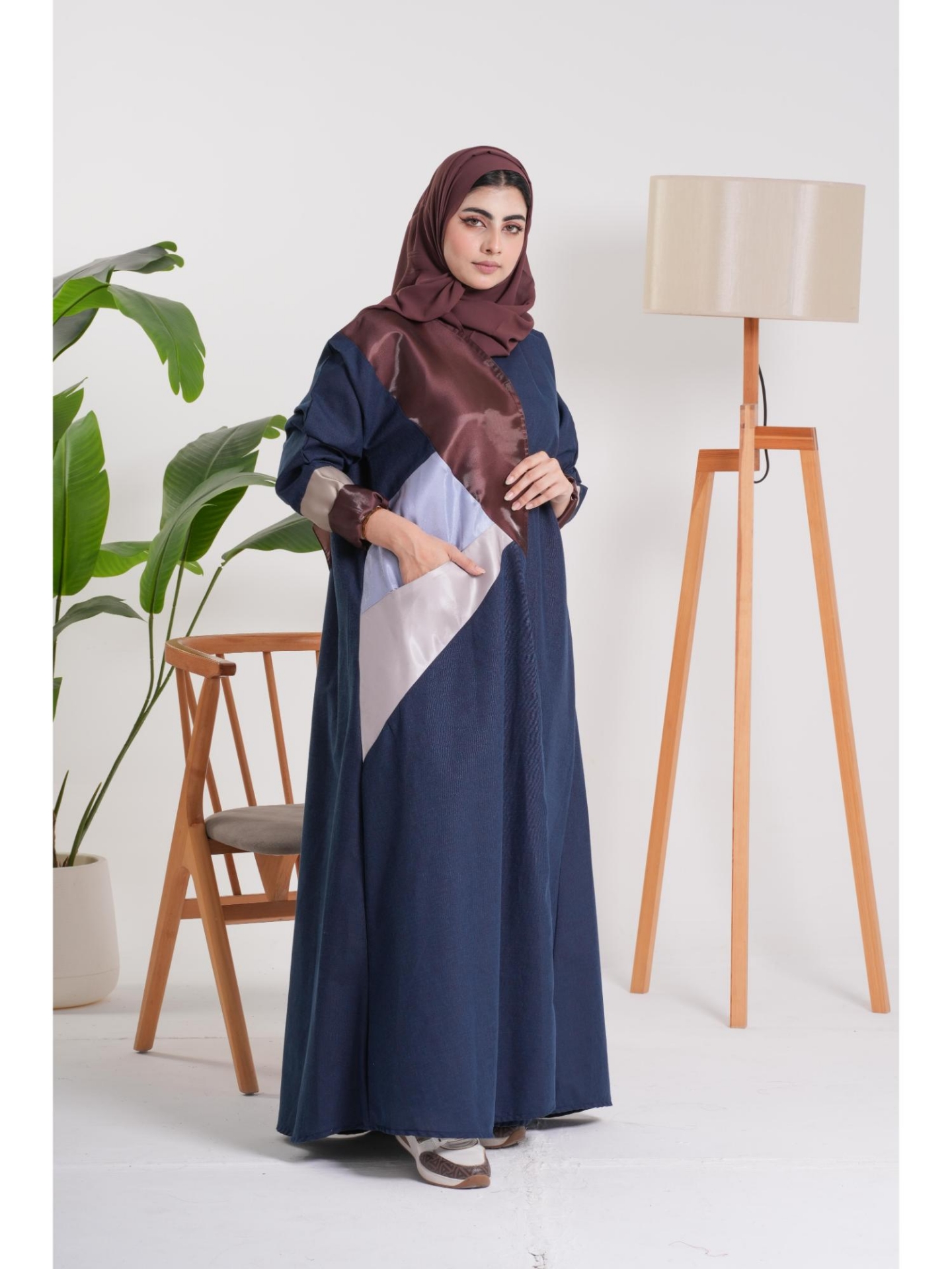 عباية التدرج الحريري الليلي هي تجسيد للأناقة العصرية والملابس المحتشمة. صُنعت العباية بشكل أساسي من قماش غير لامع باللون الكحلي العميق، وتتميز بتفصيلة مبتكرة لكتلة لونية مائلة (Cut & Sew) على الجزء العلوي الأمامي. هذه التفصيلة تجمع بين ثلاثة ألوان وأقمشة: اللون الكحلي الأساسي، شريط مائل من الساتان البني الداكن (الشوكولاتة) اللامع، وقماش رمادي فاتح متباين. يوفر قماش الساتان اللامع توازناً فريداً مع القماش الأساسي غير اللامع، مما يجعل العباية مثالية للمناسبات المسائية الخاصة أو الاجتماعات الأنيقة. القصة واسعة ومريحة، كما أن الأكمام تُظهر لمسة من التباين في الألوان المدمجة في التصميم. قطعة مميزة لمن تبحث عن الأسلوب الجريء والمحتشم في آن واحد.