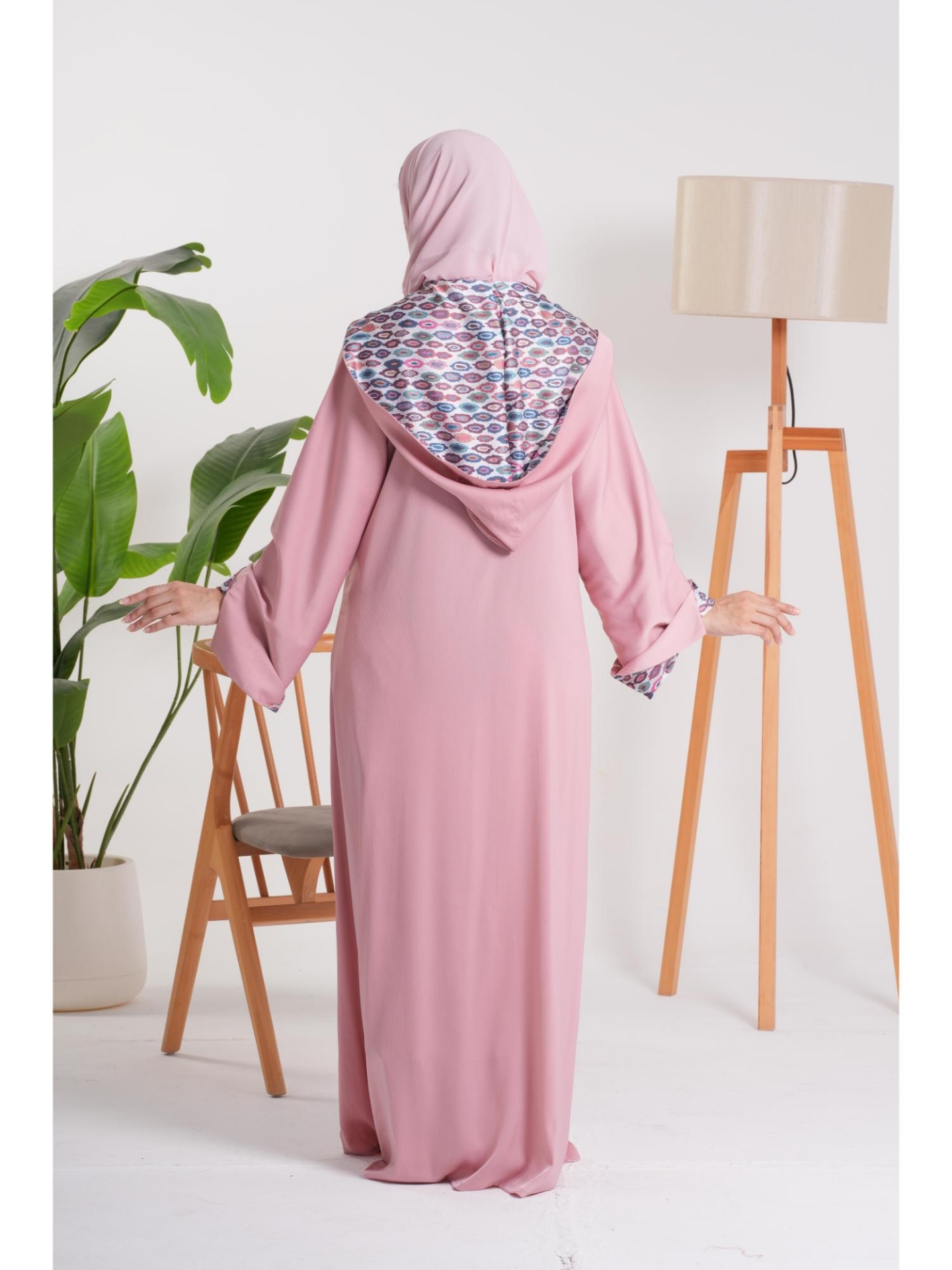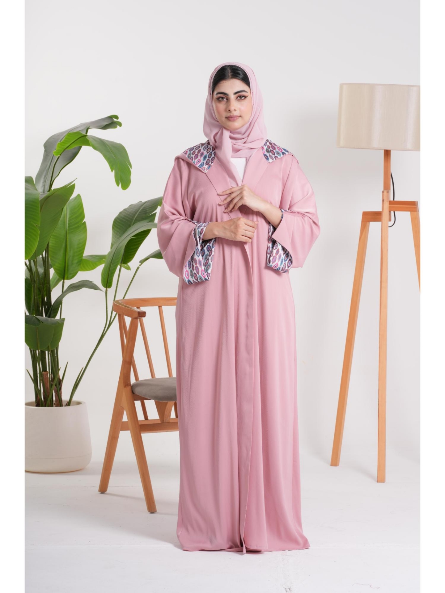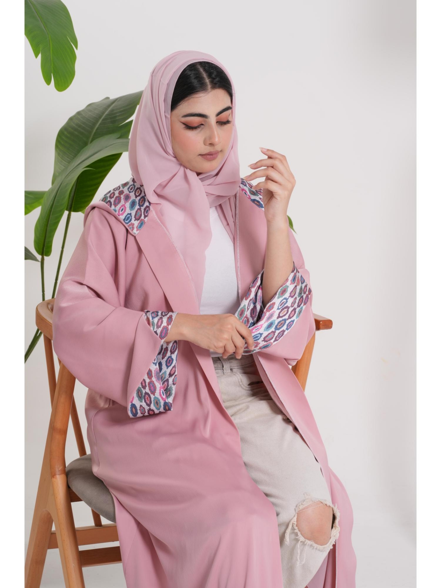 عباية اللؤلؤة المطرزة هي قطعة مثالية لمن تفضل الألوان الهادئة والتفاصيل الجذابة. تتميز العباية بلون وردي مترب (Dusty Pink) ناعم جداً، مع قماش انسيابي ومريح ينسدل بأناقة. يضفي التصميم المفتوح والواسع سهولة في الحركة والارتداء. العنصر المميز هو الإضافات الملونة على طول حافة الياقة الممتدة حول القلنسوة (القبوع)، وحواف الأكمام. هذا التطريز الهندسي يستخدم مزيجاً من الألوان المبهجة مثل الأزرق والوردي والأبيض، لكن بتدرجات هادئة تتناغم مع اللون الأساسي للعباية. مثالية لإطلالة نهارية أنثوية ناعمة، وتناسب الفتيات والسيدات الباحثات عن الاحتشام بلمسة من الحيوية.