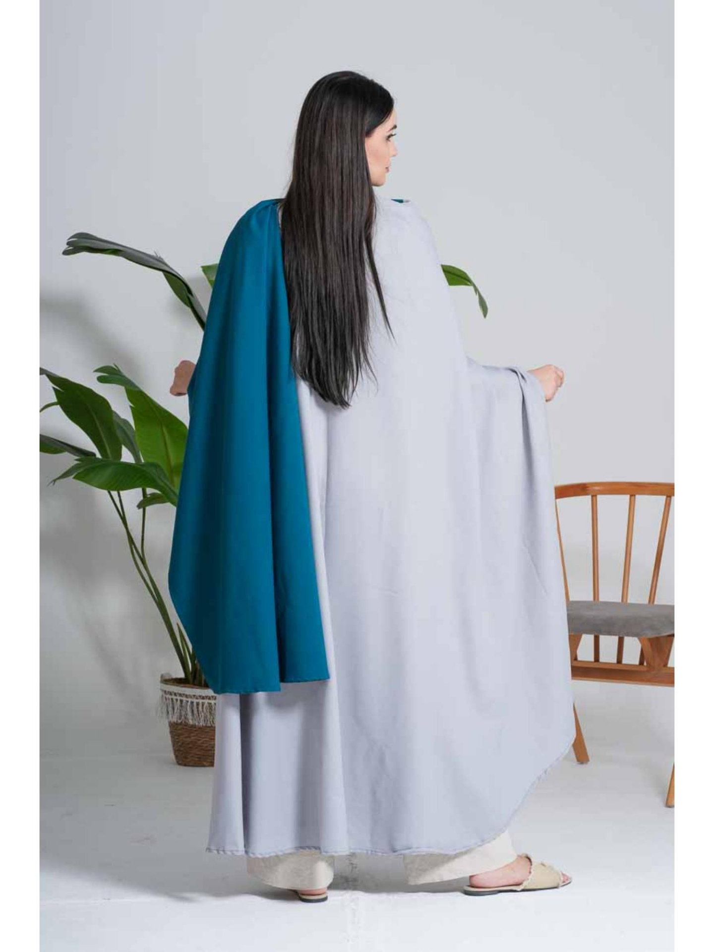 استمتعي بالراحة الفائقة والأناقة العصرية مع هذا القفطان الطويل، المصمم بقصة واسعة ومريحة للغاية وأكمام خفاش انسيابية. يتميز التصميم بلمسة فنية مميزة تعتمد على التباين اللوني الجذاب: اللون التيل العميق (الأزرق المخضر) يسيطر على الجسم ليمنحك مظهراً آسراً، بينما اللون الرمادي الفاتح يحدد الألواح الجانبية والأكمام ليضيف عمقاً وتوازناً. هذه القطعة مثالية لقضاء عطلات أنيقة، أو للارتداء اليومي الفاخر الذي لا يتطلب جهداً، حيث تجمع بين الحشمة والجرأة اللونية.