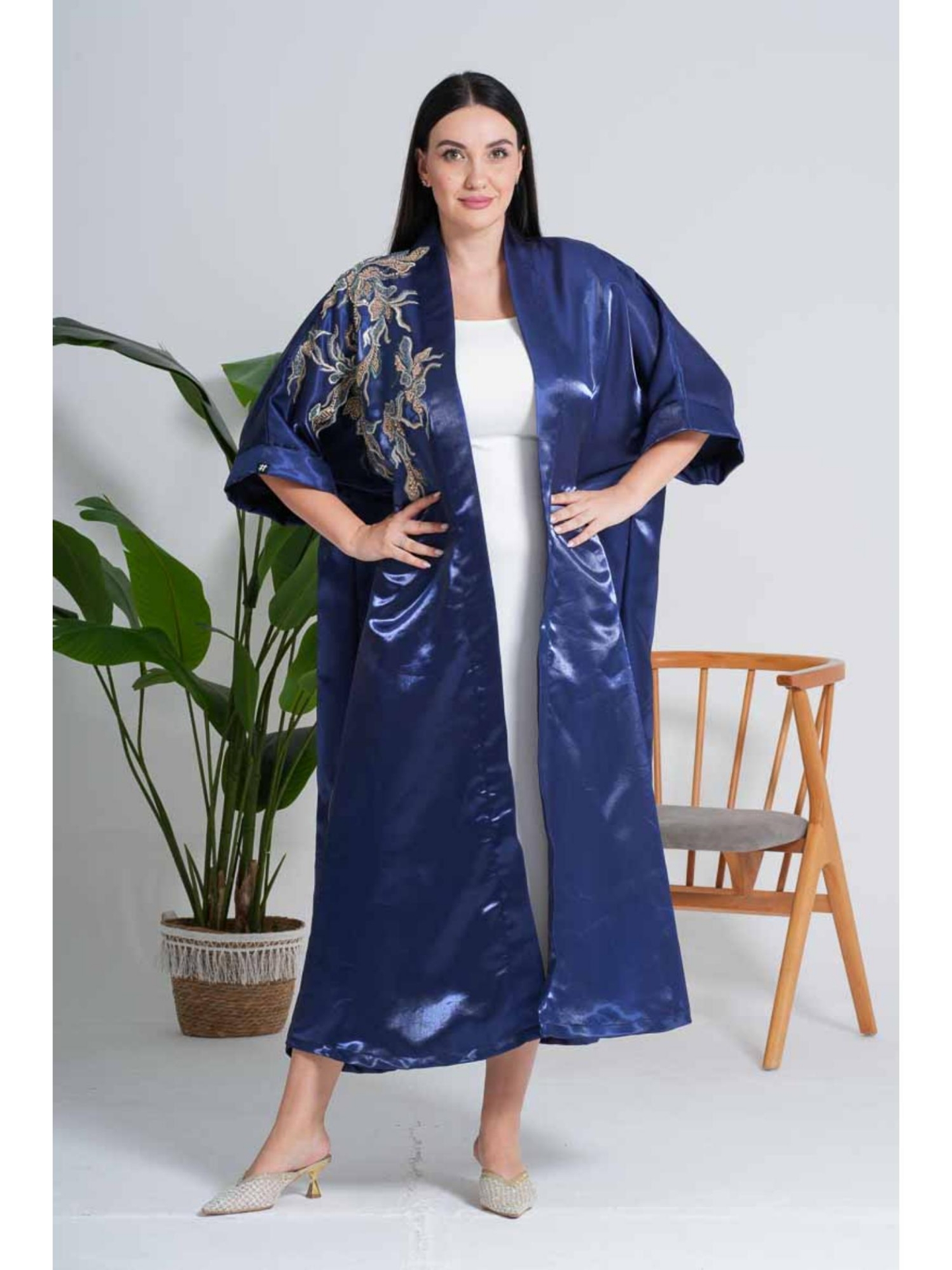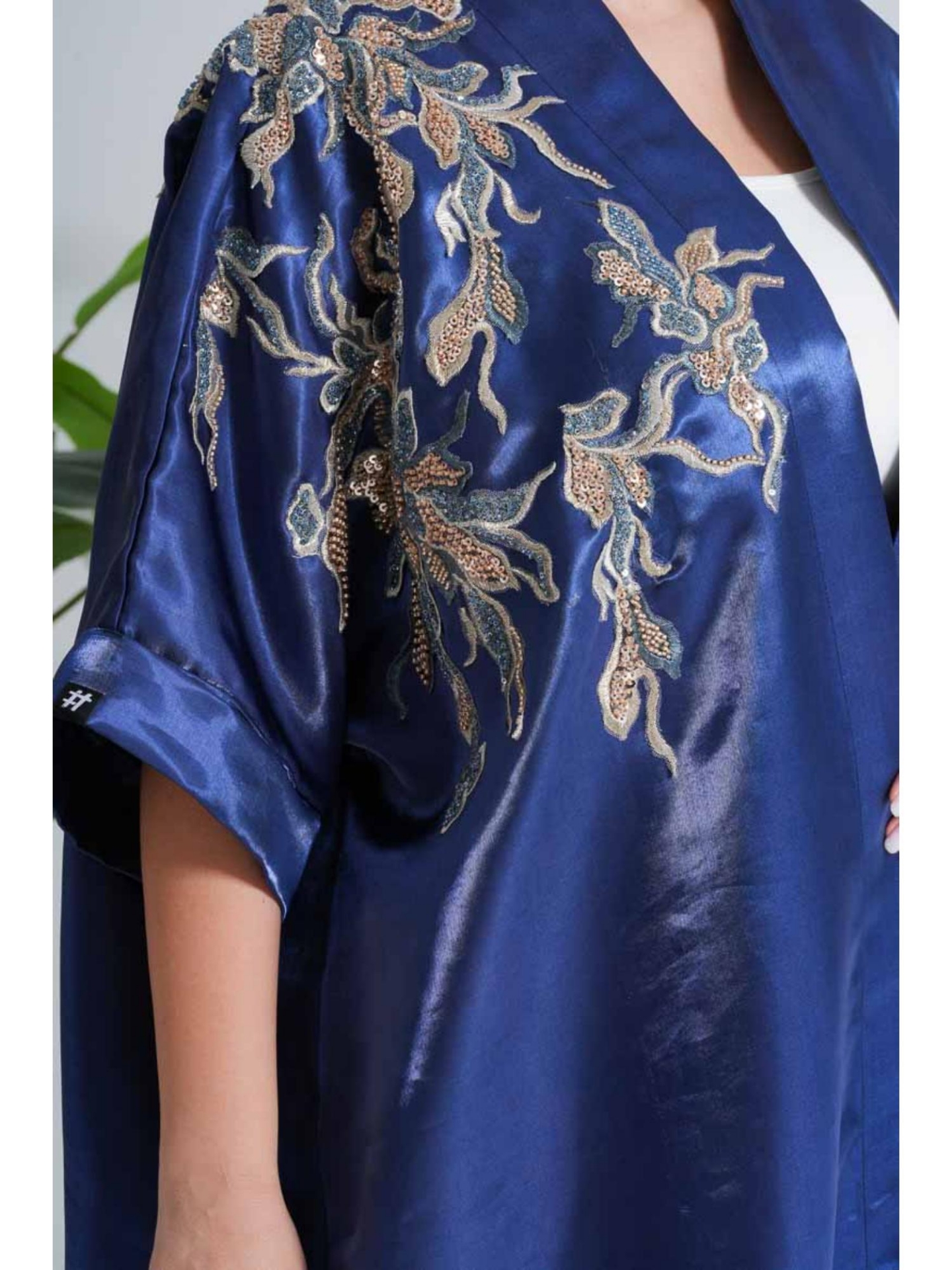 تألقي بإطلالة ملوكية آسرة مع هذا الكيمونو المفتوح والفاخر. صُنع من قماش الساتان الحريري عالي الجودة الذي يتلألأ بلون الأزرق الملكي العميق، مما يجعله قطعة أساسية للمناسبات المسائية. يتميز الكيمونو بقصته الواسعة والمنسدلة وأكمامه القصيرة العصرية. أما اللمسة الأكثر سحراً فتكمن في التطريز اليدوي المتقن بالخيوط الذهبية/البرونزية على أحد جانبي الصدر والكتف، والذي يضيف عنصراً فنياً فريداً وفخامة لا تضاهى. هذه القطعة هي خيارك الأمثل لحضور الحفلات والسهرات بكل ثقة ورقي.