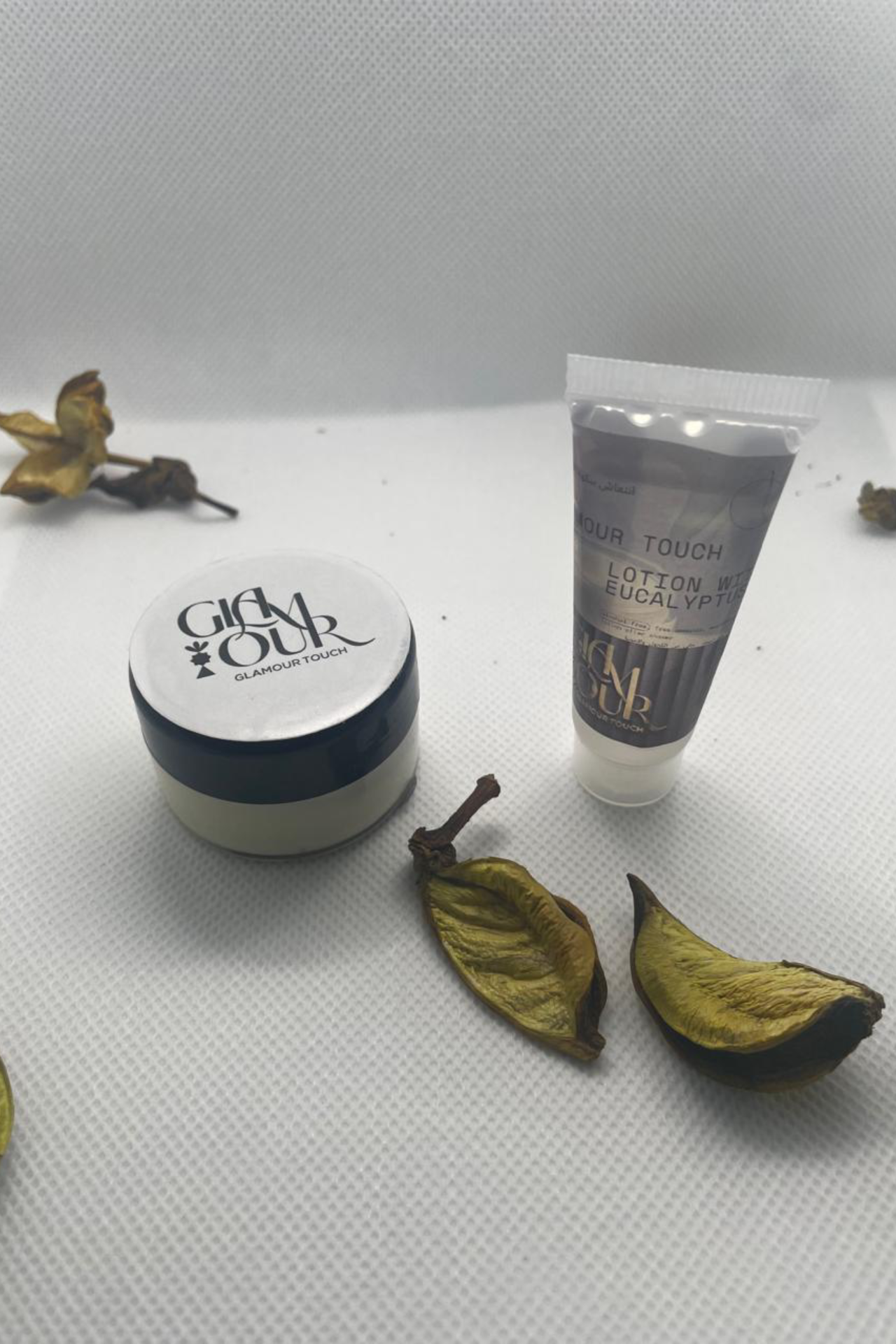 Glamour Touch skincare products, featuring a refreshing and moisturizing Eucalyptus Lotion, alongside a concentrated moisturizing jar for daily use. Ideal for soothing and nourishing the skin.